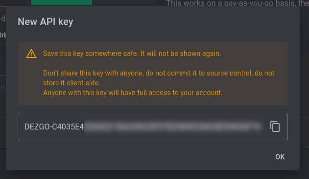 Your key is now ready to be used. It will appear in your API keys list where you'll be able to revoke it at any time.